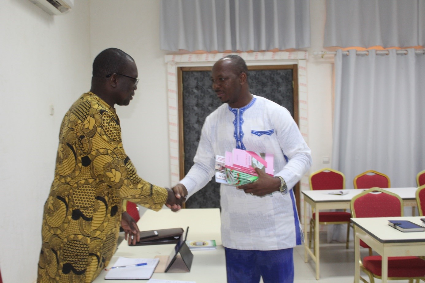 Poignée de main entre le CGE (à gauche) et le président de la CAGIDH après remise d’une documentation.
